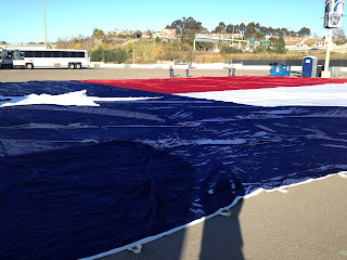 We were almost immediately upstaged by what is probably the only flag in the entire world bigger than ours! A football-field-sized American flag held by 250+ Marines. Hah - we did ours with only fifteen! (Fifteen...)